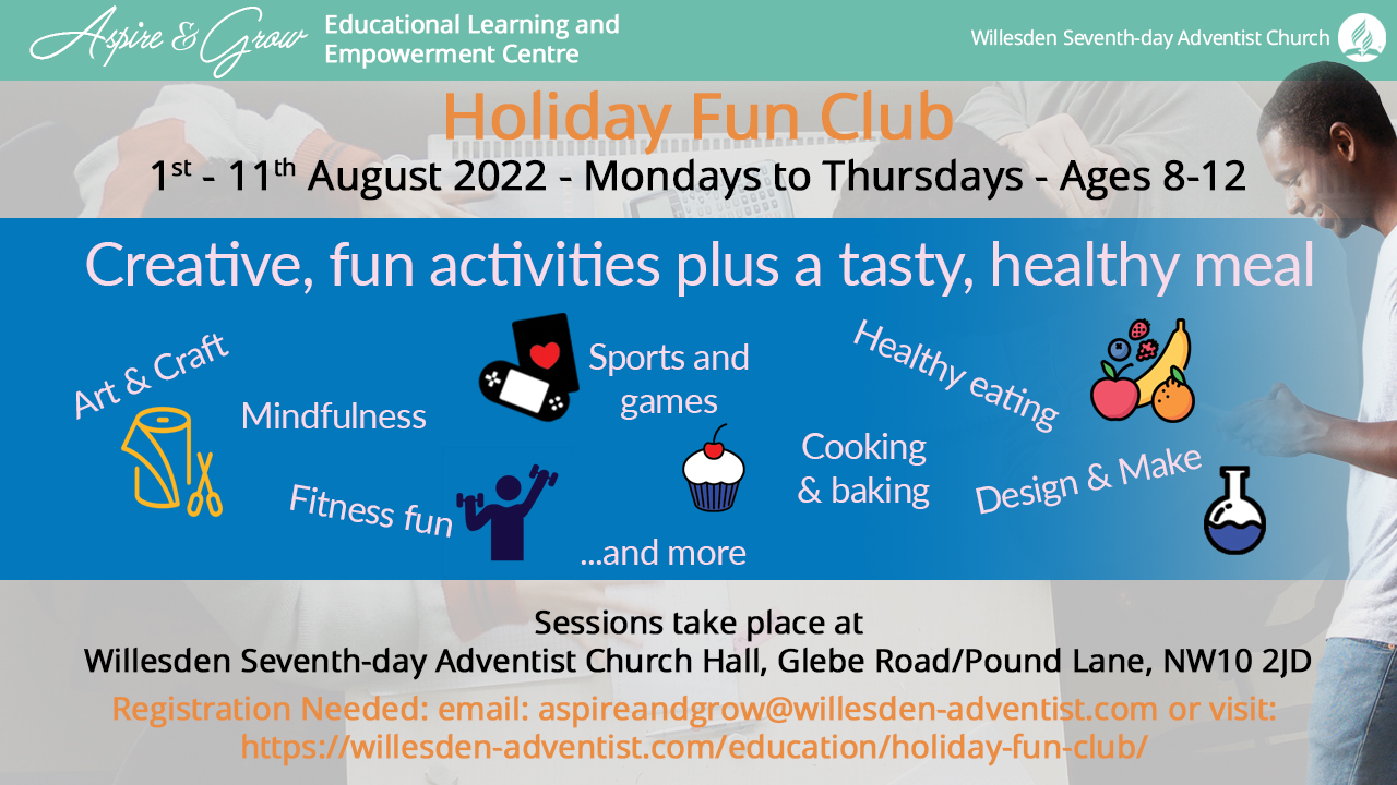Willesden Seventh-day Adventist Church 1 Glebe Road, Willesden, London, United KingdomWe are back for the Summer Holiday. If you have children ages 8-12, we have two weeks of fun for them during the summer holidays. The Holiday Fun Club will run from 1st - 11th August 2022 on Mondays to Thursday from 10am to 2pm. Registration is needed - email: aspireandgrow@willesden-adventist.com or visit: https://willesden-adventist.com/education/holiday-fun-club/.